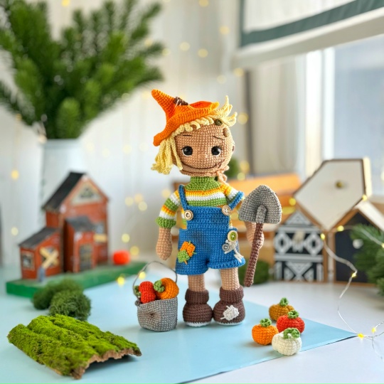 1. Цвета пряжи: YarnАrt Jeans - Состав: 55 % хлопок, 45 % акрил. Вес – 50 г. Длина 160 м. 62 – белый (для одежды и аксессуара) 07 – бежевый (для тела) 17 – джинсовый (для одежды) 69 – трава (для одежды) 84 – горчичный (для тыквы) 85 – рыжий (для тыквы) 46 – серый (для ведра и лопаты) 03 – молочный (для тыквы) 05 – кремовый (для одежды) YarnАrt Iris – Состав: 100% мерсеризованный хлопок. Вес – 20 г. Длина 138 м. 935 – черный Alize Cotton Gold – Состав: 55 % хлопок, 45 % акрил. Вес – 100 г. Длина 330 м. 493 – коричневый (для обуви) 187 – лимонный (для одежды) 83 – тыквенный (для одежды и тыквы) 110 – желтый (для одежды)
